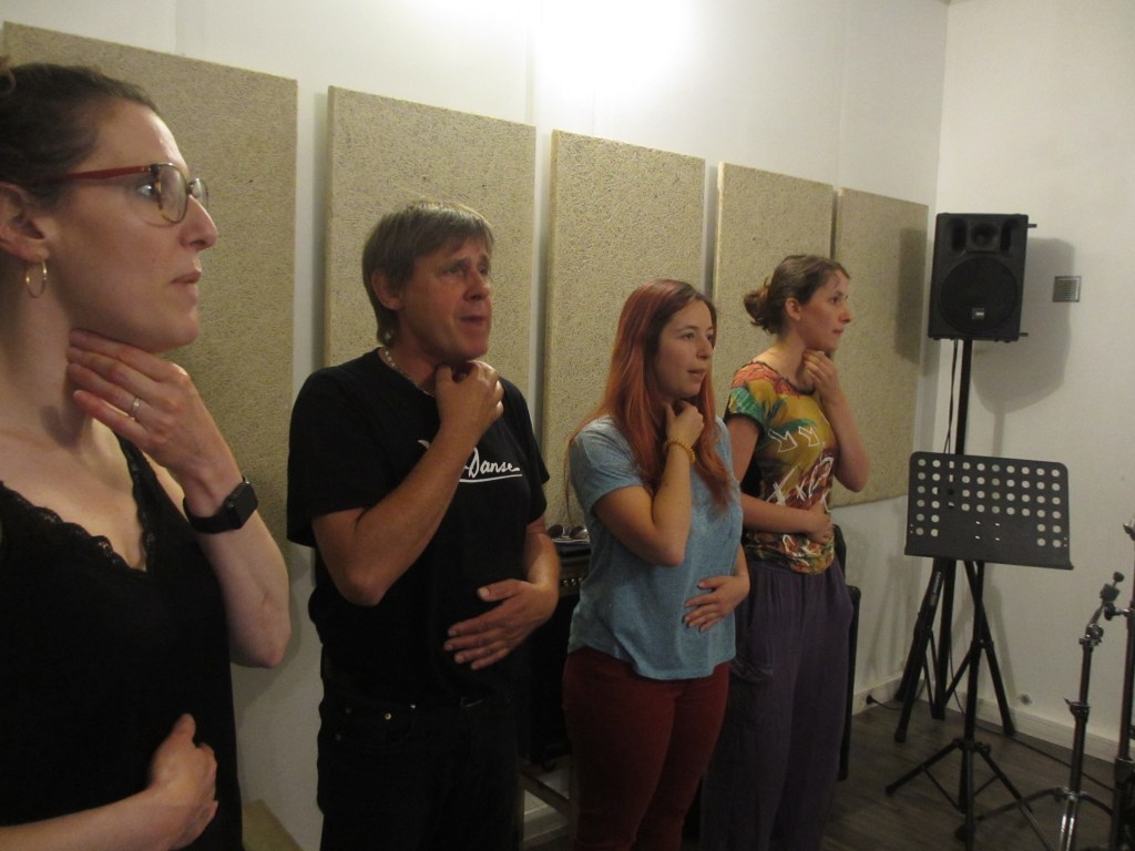 La pratique consciente du chant délivre en plus du son, les émotions, la vérité du moment. Elle tisse un lien entre les individus. Par les échanges vibratoires sonorisés, par le rythme respiratoire de groupe, par les liens de résonances et l’aspect polyphonique, la voix va toucher émotionnellement et positivement les couples » Émetteurs / Récepteurs » pour entrer dans une cohésion et une osmose jubilatoires.